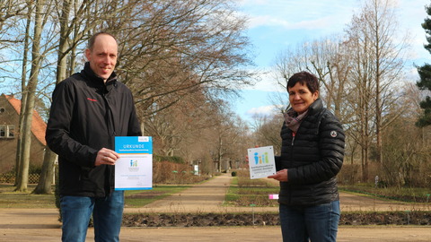 Der Park punktet mit passender Qualität und Service für den Familienurlaub im Lausitzer Seenland. Kathrin Winkler, Geschäftsführerin des Tourismusverbandes Lausitzer Seenland e.V. übergab die Urkunde und die Plakette an Stefan Palm, Parkmanager des Ostdeutschen Rosengartens.